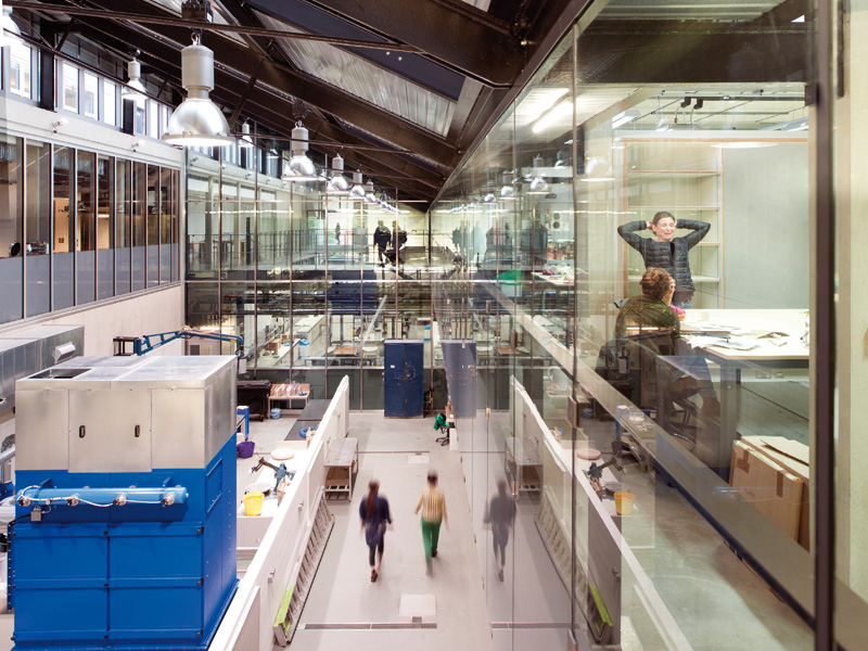 on 22 March 2016A new building by Stirling Prize and Blueprint Award winner Haworth Tompkins completes its ensemble at the Royal College of Arts’ Battersea campus. The practice’s industrial approach embodies advice given by Jim Cadbury-Brown, architect of the original iconic RCA building in Kensington. Herbert Wright reports