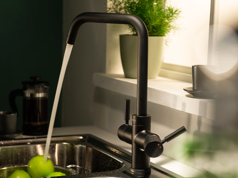 PRODUCT – Answering growing demand for 24/7 convenience that is practical and beautiful, the Pronteau 4 IN 1 Propure Monobloc Quad is seen here in an industrial-style Matt Black finish. Available in five on trend finishes and two spout designs, this 4 IN 1 kitchen tap is a must for the design and time conscious. The steaming hot water is delivered via a two-stage safety handle and with cold filtered drinking water on tap as well as the domestic hot and cold supply you truly have everything you need packaged up in a sleek design that sits proudly in an array of kitchen styles.