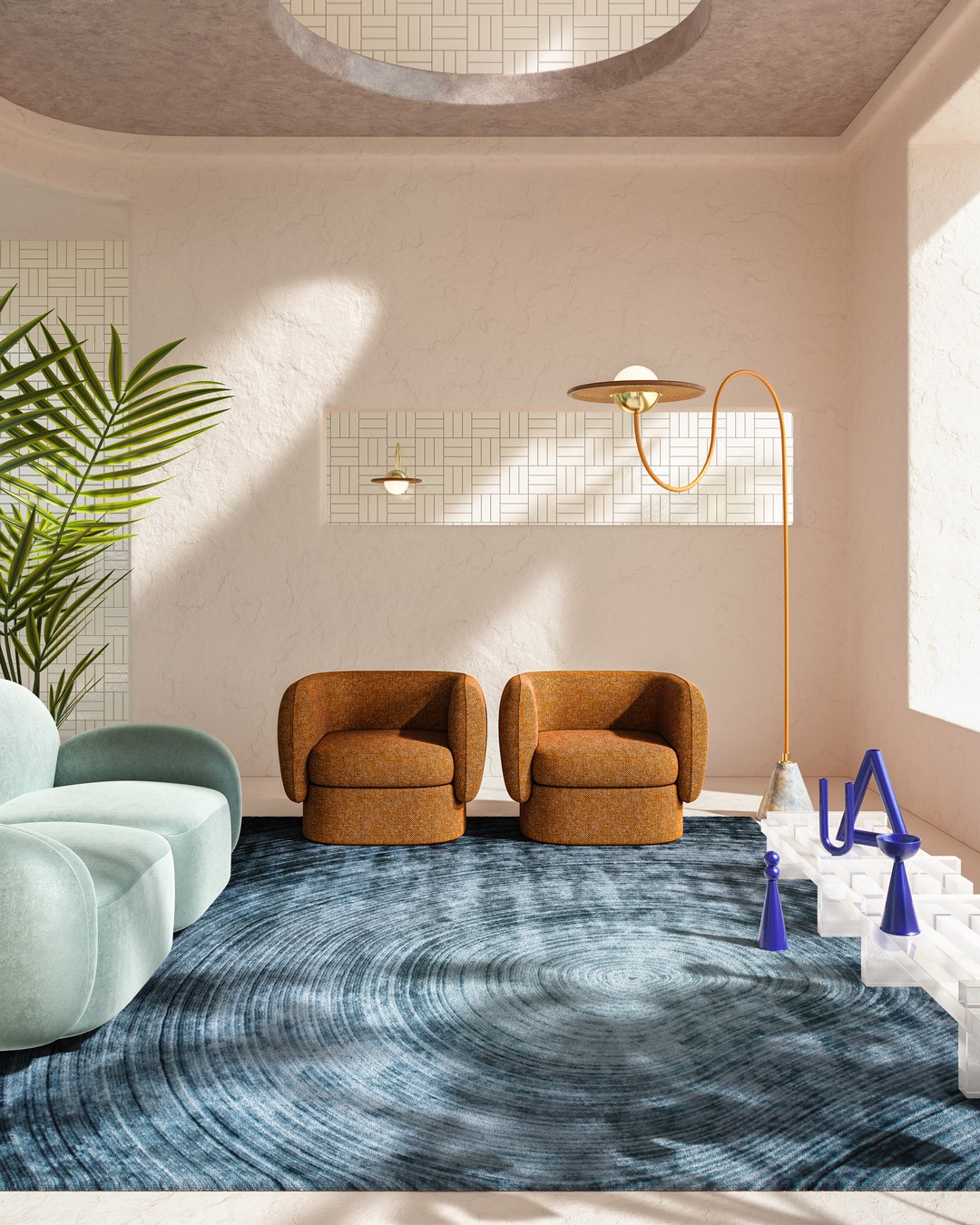At the dining table, Stella Barlowe dines amongst another of our best - the Neva Fade in Eucalypt. Neva Fade is TSAR's award-winning customisable carpet and rug design. The raised cut pile rows gradate seamlessly from both dark to light, creating a mesmerising landscaped ambience.