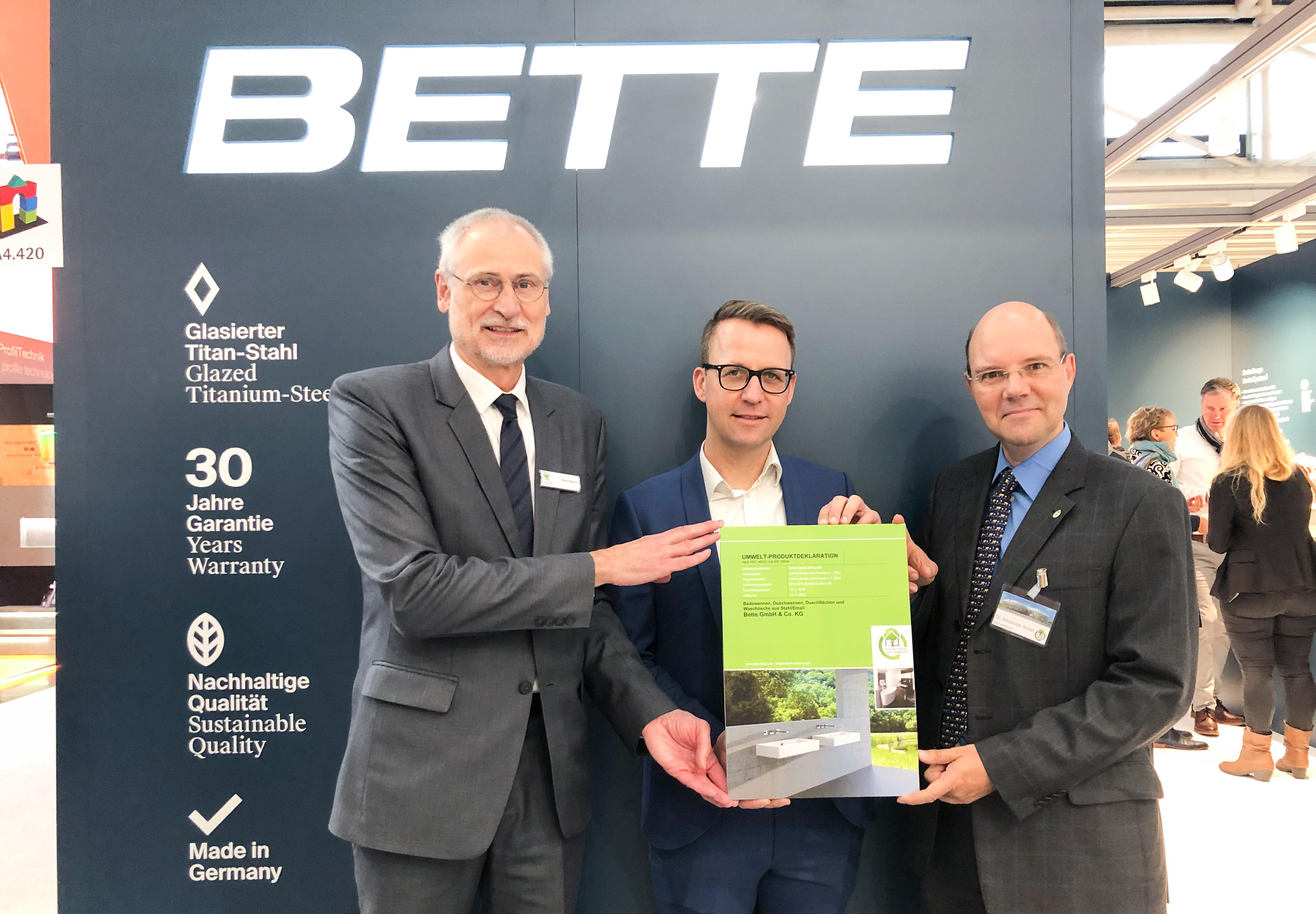 Bette’s head of marketing, Sven Rensinghoff (centre) being presented with the EPD by Hans Peters (left) and Dr. Alexander Röder of independent assessors, IBU.