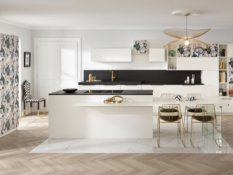 Whether adorning a selection of wall units or a column, the 3D printed finish of Algae Bloom Pearl brings a splash of bold, vibrant colour to this hub of the home. Daringly decorative, this room scheme combines Print with Loft in Blanc Laque Micron and ceramic worksurfaces in Marquina for sleek, seamless contrast. The central island is functional and practical, perfect for entertaining family and friends while its extension with glass end panel creates a dining area with a suspended effect. Added features include deep and wide pan drawers for extra storage and stunning gold handles, which co-ordinate beautifully with the golden mixer tap on the integrated sink.