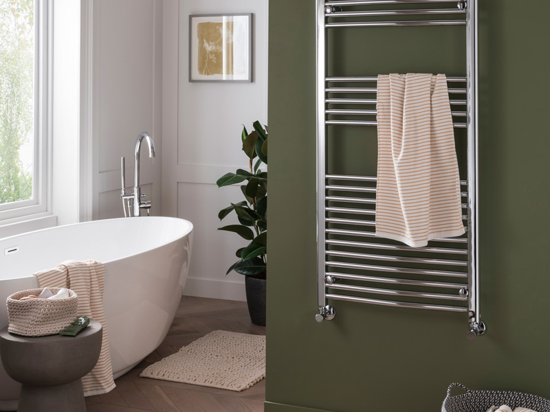 Ensuring a dedicated space to warm and dry your towels, Combes is the perfect partner alongside earthy high-fashion shades of green, which naturally emphasise the cool undertones of classic chrome.