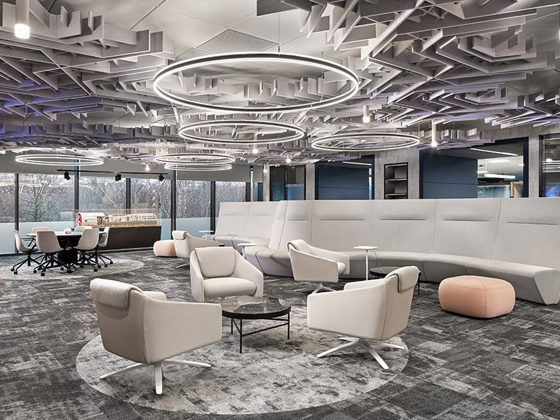 The centre piece of this Hacel designed scheme is a spacious, collaborative area which features Hacel Explora Halo luminaires suspended from acoustic sound baffles, which smoothly integrates with the more formal work areas and fosters a culture of communication and social interaction.?