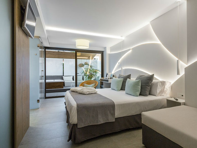 To achieve guest well-being, the interior designers looked for something that would feature smooth, continuous surfaces and light colours, along with minimalist furnishings that would add to the feeling of spaciousness. The only decorative elements included are some outside plants and the pillows and bedspread, in turquoise and gray tones, which reflect the blue of the beaches surrounding the hotel premises.