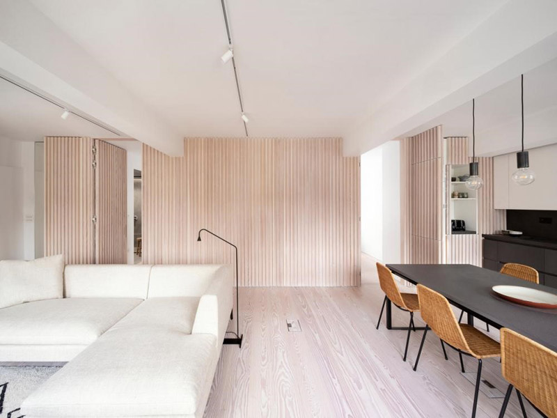The award-winning architecture and design studio, Proctor & Shaw, has completed the full interior renovation of this apartment in Marylebone, London. Throughout the apartment, the 5-metre-long solid Douglas floor planks invites nature into the space. Additionally the walls are covered with Douglas interior lists, which accentuates a sense of depth and dimension to the space. The soft, natural grain and character of the wood gives the floor and walls a subtle texture and make the space come alive.