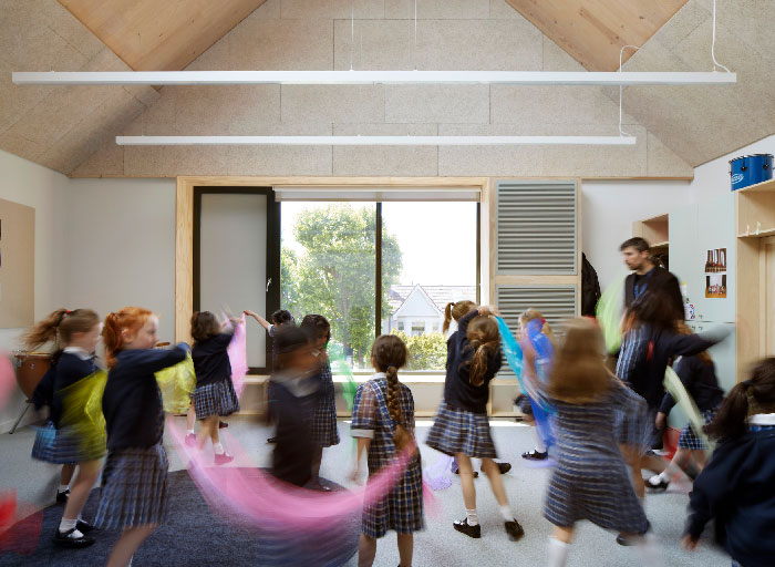 This is a perfect example of how Troldtekt’s wood wool acoustic panels can help transform educational spaces. The panels are available in a variety of different structures and colours, combining optimal sound absorption with an award-winning design. The Troldtekt range has a minimum expected life cycle of 50 years coupled with excellent resistance to humidity and tested to meet ball impact standards. The range is available in various sizes and structures, from extreme fine to fine. They can be supplied as natural wood, unpainted FUTURECEM™ offering a reduced carbon footprint and finished in almost any RAL or NCS colour.