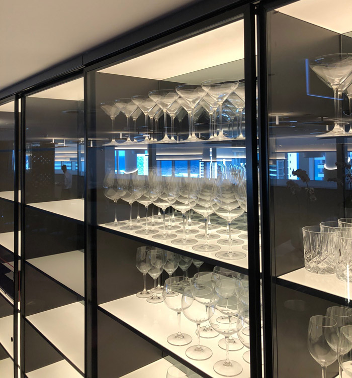 The bar area has been designed by award winning hospitality designer MIM Design. Pixalux shelves can be integrated with traditional and modern materials. The double sided illuminated shelves have transformed the appearance of the glasses adding sparkle and life to the displays as customers enter the restaurant area.