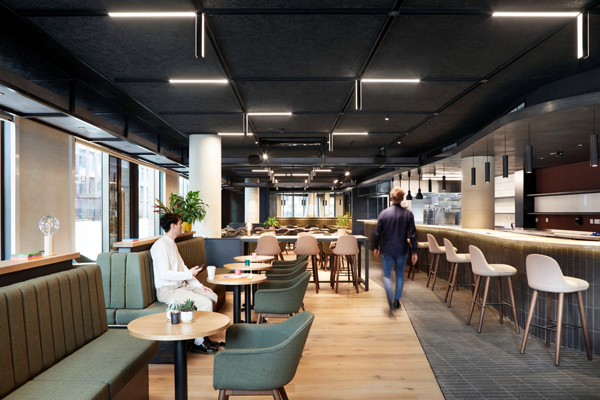 Troldtekt wood wool acoustic panelling with a black finish was specified throughout the space, punctuated by a bespoke lighting track with drop-down custom-made LED light battens further emphasising the urban and industrial aesthetic look. Troldtekt panels were specified for their excellent acoustic properties and ability to dramatically reduce sound reverberation as well as their superior environmental credentials.