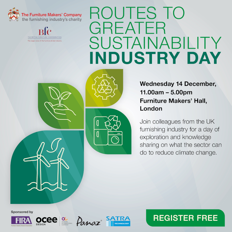 The ‘Routes to Greater Sustainability’ event is being supported by the British Furniture Confederation (BFC) and generously sponsored by the Furniture Industry Research Association (FIRA), Ocee Design, Panaz and SATRA Technology.