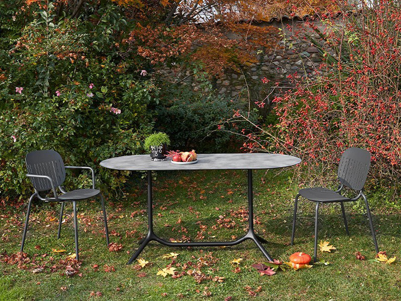 The die-cast aluminium base is in fact not a traditional monobloc, it is made up of several elements that can be diversified and replaced according to need. An industrial project attentive to the economic component, it is a truly flexible and multifaceted system that gives life to a line of tables and complements of various shapes and sizes, ideal for the home and public areas.