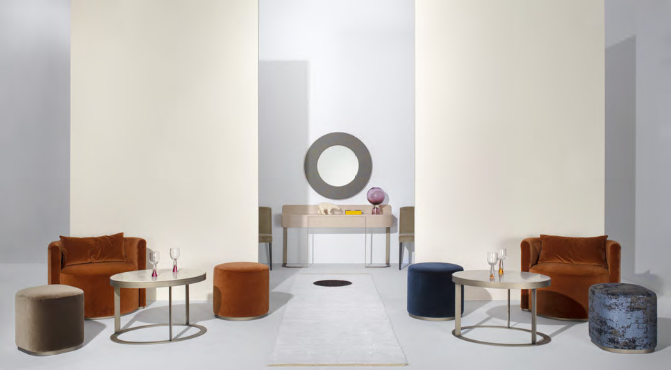 The collection comprises 29 pieces that are available in a variety of different finishes and fabrics, with profiles inspired by natural forms and the strength of the elements. The essential lines of these pieces create a delicate minimalism: the chairs are seductive velvet stones, the chaises-longues combine simplicity and solidity, the mirrors with textile frames give a realistic three-dimensional sense of a carving or erosion. Naturalness, minimalism and a careful balance also characterise the colour palette. Warm and cold hues intertwine unexpectedly but never randomly: strong shades that call to mind nature’s most intense countenance — the warmest earthy colours, brown, full yellows... — contrast with the pale nuances of linens that are reminiscent of stone or sand; but also, at the other end of the spectrum, dark velvets announcing the colour of the depths, somewhere between blue and brown.