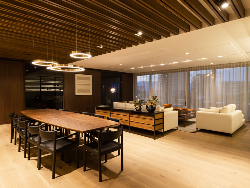 Upon entering, a hall welcomes the user with a sculptural lattice of flamed black clay as a visual finish. When crossing the drawing room, the social areas are discovered, conformed by the living room, the dining room, and the terrace. These spaces function as the heart of the apartment, and open completely to the exterior through generous floor-to-ceiling windows, giving the sensation to the interior of being an extension of the terrace, creating interesting views towards the surroundings.
