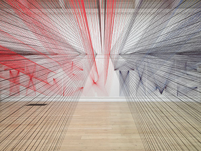 12 April 2013Insomnia strings people out, but Californian artist Pae White used the condition to conceive a site-specific installation that strings out 48km of yarn across 4,725 eye screws, spanning the main gallery of the SLG. The result for her was therapy, and for the viewer a remarkable play on space and typography.