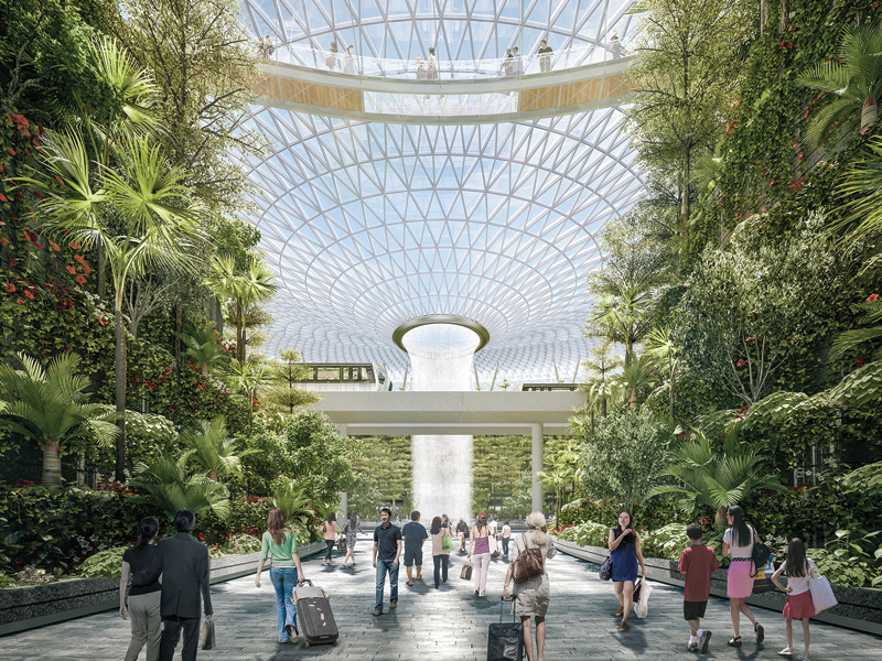 Moshe Safdie has taken on the ambitious brief to make Singapore’s Changi hub a ‘lifestyle destination’ — a distinct change of emphasis for an airport whose greatest claim to fame has to date been the ease of escaping it during layovers on free city tours. Jewel Changi will link Changi’s terminals with enticing hotel, retail and leisure facilities with a ‘forest valley’ at its core. The five-storey indoor garden will mimic a natural forest with walking trails, waterfalls and seating areas. Passengers will access the garden via escalators traversing man-made ‘canyons’ dividing it from a multistorey shopping centre.