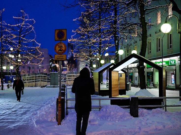 Central to the design is the adjustable lighting that users control with a touch of a button — offering a brighter haven in the dark winter months. They wanted the bench to work as a meeting point and feature as an urban landmark in the city. The thin illuminated light panels installed onto the roof-like overtop were chosen, used to gently reflect the warmth of the wooden frame, making it a comfortable, safe refuge for users.