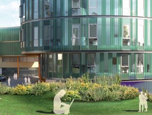 Ryder Architecture's simple yet elegant design is based on two contrasting but complementary elements - a sharp-edged, rectilinear block that cantilevers out to face the campus's main paths and a flowing organic form that snakes across to form the link with IC1. The cantilever box will be solidly clad in dark-grey linear rainscreen panels, while a contrasting mix of clear and translucent/ frosted Reglit panels will clothe the curvature and fluidity of the organic form.