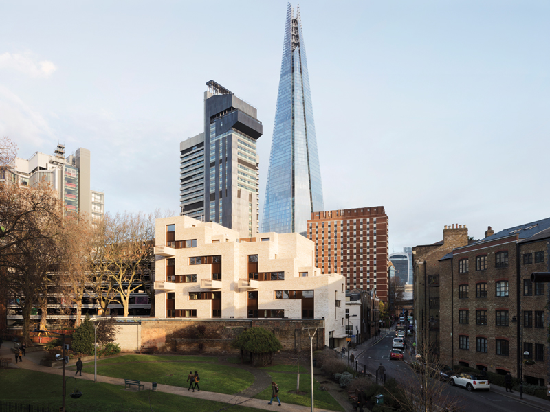 In the shadow of The Shard, a mere one-minute walk south from the new London Bridge, you come across a small and unassuming corner park. Stop and turn around, though, and you are suddenly struck by the vision of stacked pale-brick cubes, gently reminiscent of Moshe Safdie’s Habitat 67 in Montreal — ‘Tetris brutalism’ might be a good way to describe its style. The Shard’s iconic glass peak and the stocky tower of Guy’s Hospital poke above the new south London development as if in a playful competition of architectural styles and materiality in the cityscape.