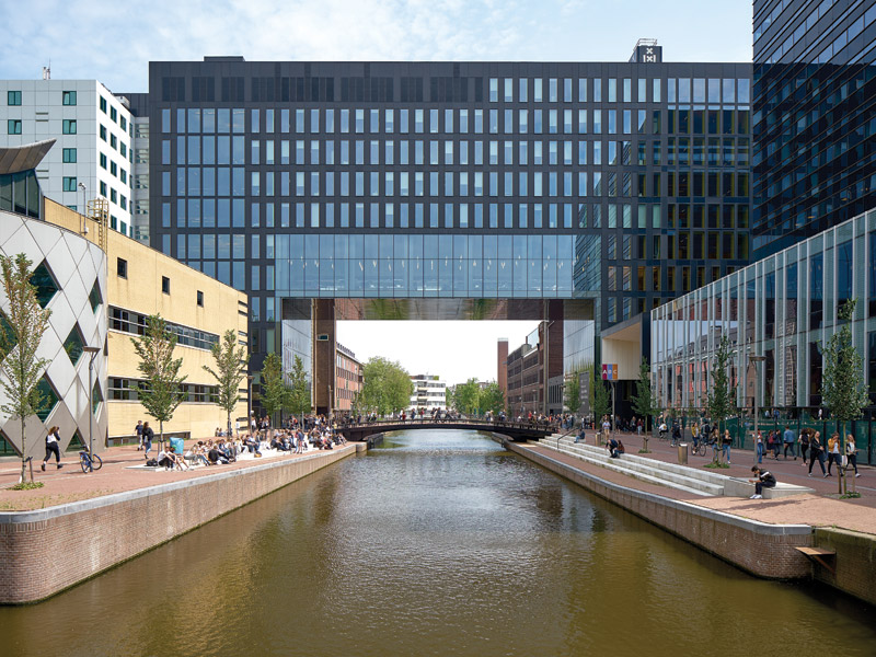 After 11 years and an iterative, collaborative process, AHMM’s repurposing of the University of Amsterdam’s Roeterseiland Campus, on the southeast edge of the city centre, is complete. The project has transformed two science laboratory buildings from the Sixties into a renewed, bright, coherent campus that better serves the needs of staff and students of the law and social sciences faculties that have moved in. AHMM’s strategy, focused on connectivity, started with the campus’ relationship to one of the most iconic aspects of Amsterdam: its canals.
