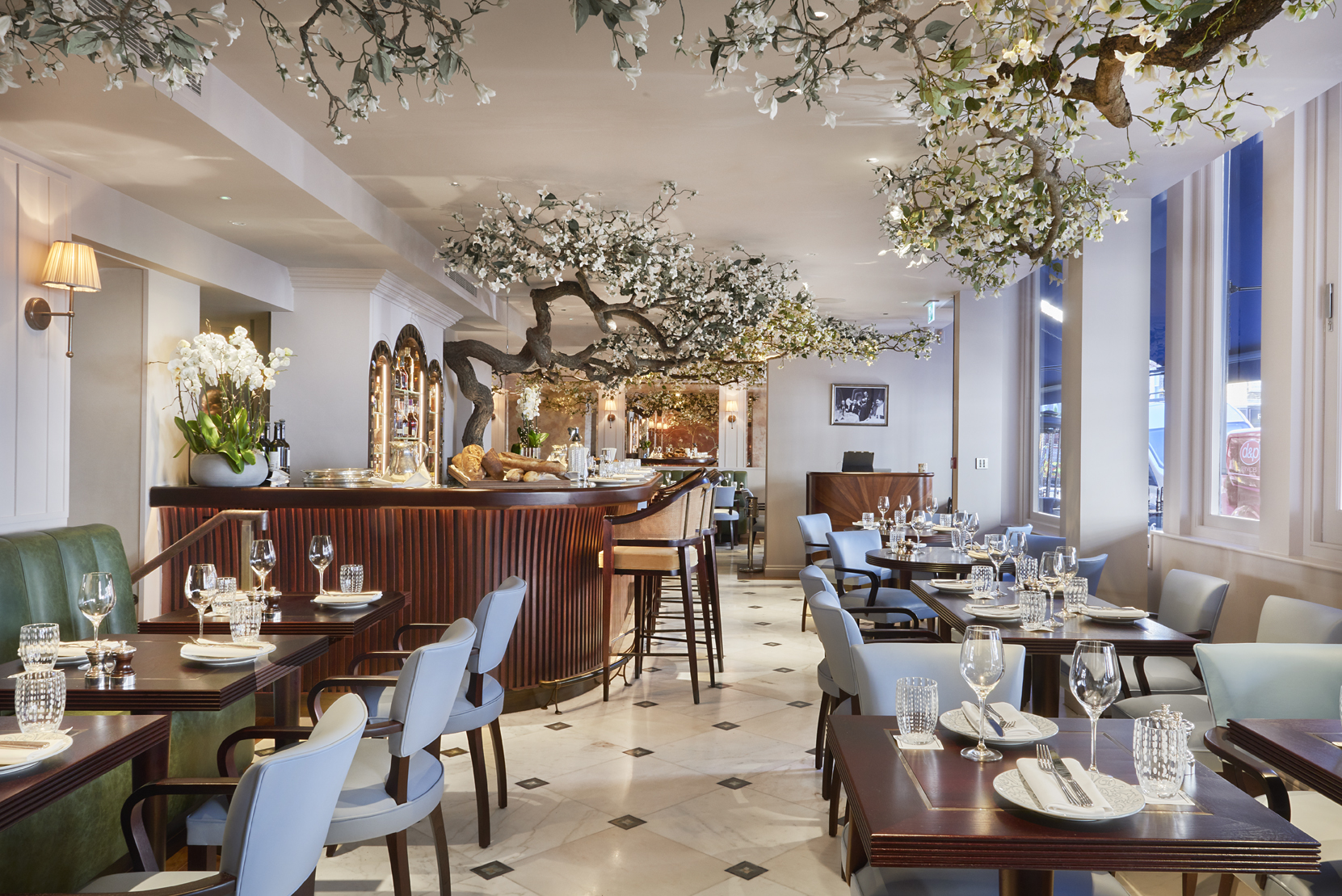 Explaining how the team installed the trees, van Braam says, “Once we had firmed up a 'look' and developed a concept with Kelly and the A.O.K team, I went about selecting the exact shapes and branch growth formations required to best fit the space and shape of the room. It is an involved and laborious task, but a key aspect. The trees themselves are engineered and sculpted in a modular fashion out of sustainably sourced limns from here in the UK; the exact method, technique and approach being pivotal to the sculptural, flowering feel of the trees, and their 'belonging' to the space itself.”