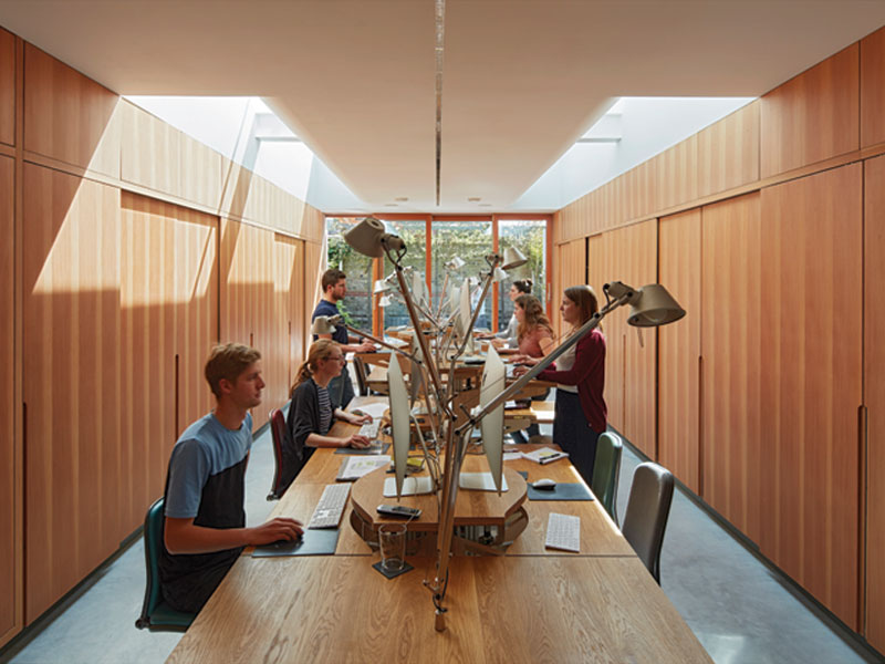 The office was completed in 2017. With the final touches put to the barn in 2018, the whole site has become an exemplar for how the practice wishes to design and to operate, says Feilden: ‘It was always about lean architecture and social architecture – having an outward-facing, civic approach.’ It also demonstrates the practice’s interest in and commitment to education, an area it has won an increasing amount of business in, as well as social sustainability. As the Guardian’s architecture critic Oliver Wainwright declared, having seen the completed site last year: ‘It would be hard for any prospective client to visit the studio and not be seduced by the pastoral utopia the team have created here.’ Feilden says: ‘Bringing clients here is just so different. Now you can entice them over. That helped win quite a few of our more important projects, especially in education.’