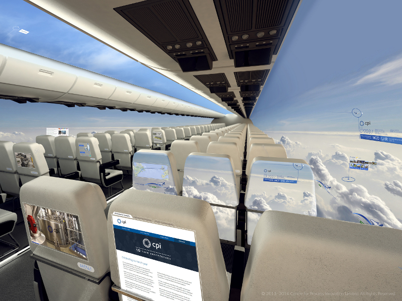 According to the UK based Centre for Process Innovation (CPI) 'The days of glimpsing the world through a tiny plastic porthole when you fly are soon to be a thing of the past; future aircrafts will offer a crystal clear panoramic view without any windows at all.'