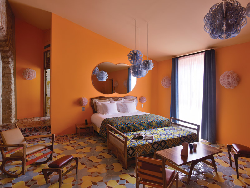 Encompassing a kaleidoscope of colours, these geometric tiles have been designed and laid in such a way as to ensure that no floor area looks the same; the 18 colours and 11 shapes morph from one room to another, so that there is both a kind of fractal intensity and uplifting variety wherever you look – they are even layered in the swimming pool. They cover almost 6,000 sq m, and it was this gesture that Pardo first conceived as a way of bringing the hotel’s disparate spaces together. He told the FT: ‘The place needed some kind of an organising principle and I thought this would be interesting and eccentric because it uses such a large amount of tile. We planned it all digitally. We had this spreadsheet with more than two million pieces of tile, each accounted for with where it needed to go. It was an interesting challenge.’