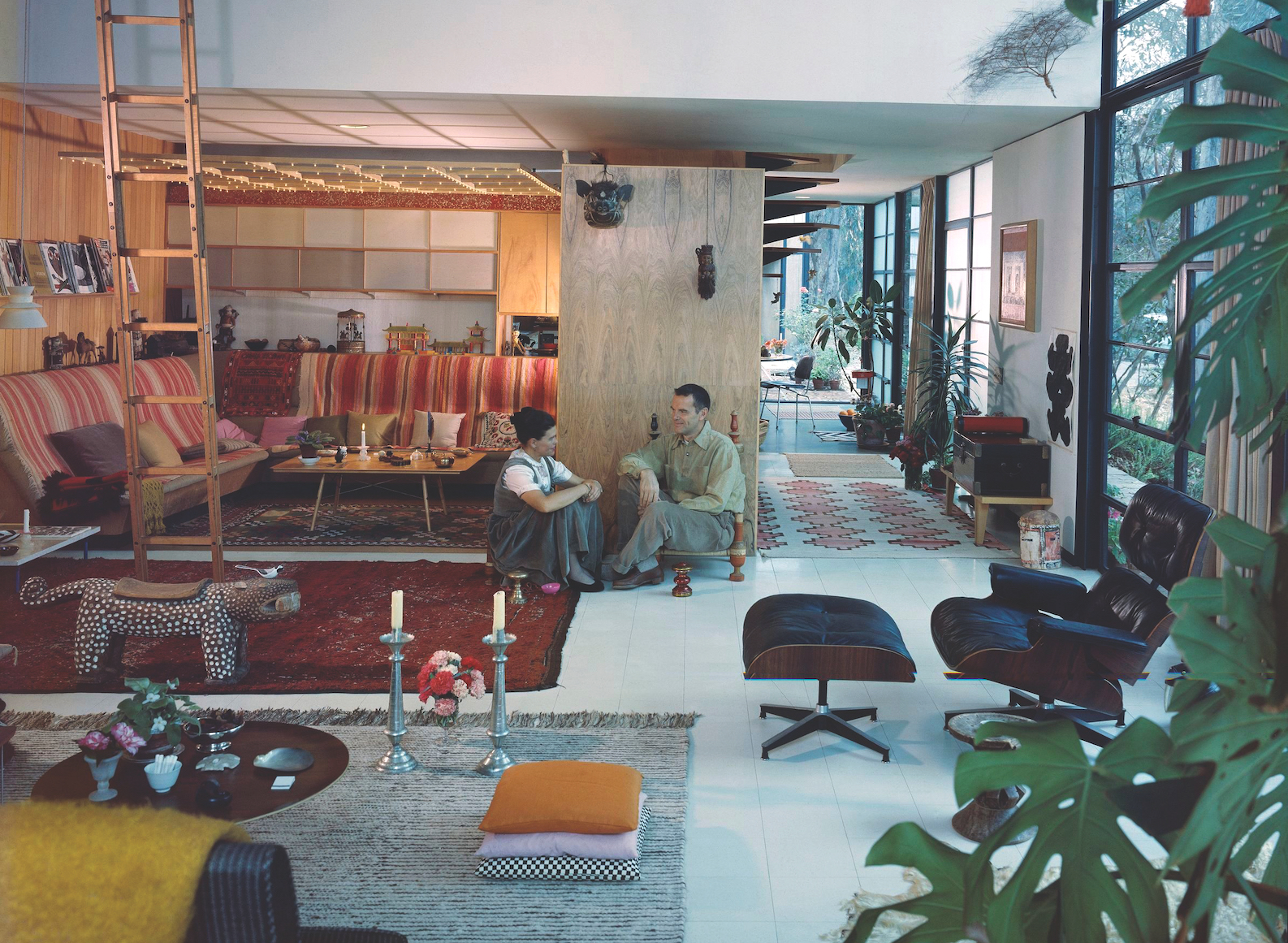 The entire contents of the double-height living room were loaned to the Los Angeles County Museum of Art in 2011 for an exhibition. Image credit: Photo by Mitsuya Okumura © Eames Office LLC (www.eamesoffice.com). All rights reserved
