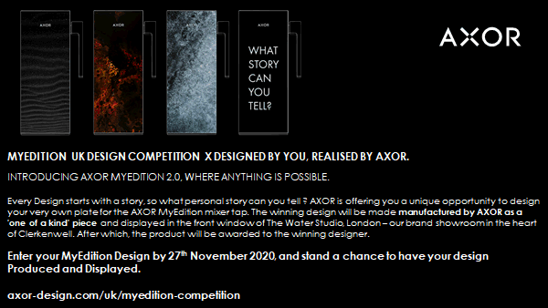 Enter your AXOR MyEditionDesign by 27th Nov 2020and stand a chance to have your design Produced and Displayed at the Water Studio. London.