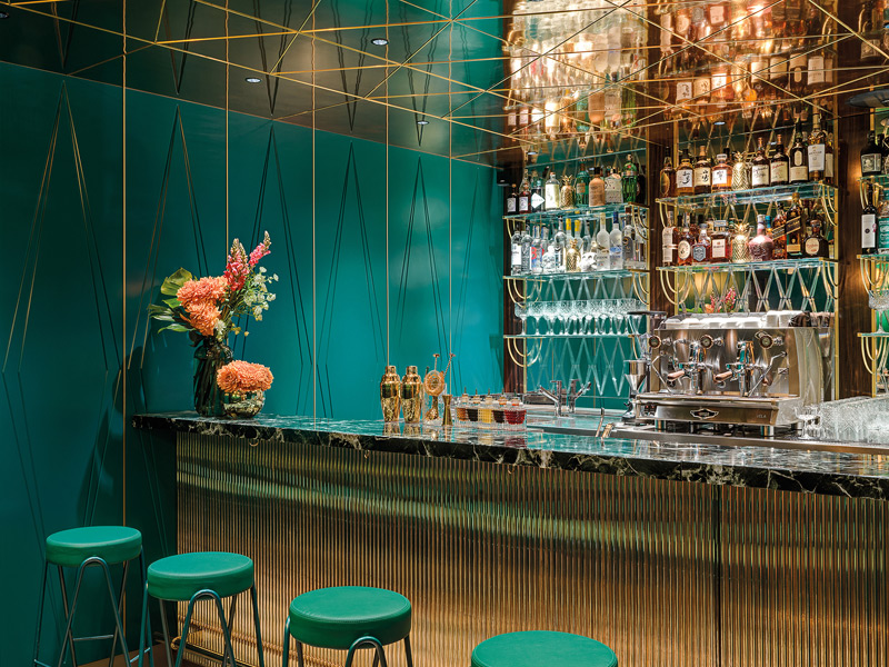 The 510 sq m restaurant is set over three storeys in the beautifully refurbished building, with a rosewood and green Alpi marble staircase decorated with gold-coloured wallpaper and ethereal brass-leaved chandeliers connecting the levels. At the heart of the design is the rhombus, which is woven into almost every surface detailing, but reaches its zenith in the polychrome marble floor, inspired by the artworks of futurist painter Giacomo Balla and made from over 7,000 geometric pieces of marble. Tactile velvet upholstered furniture adds to the richness of the experience.