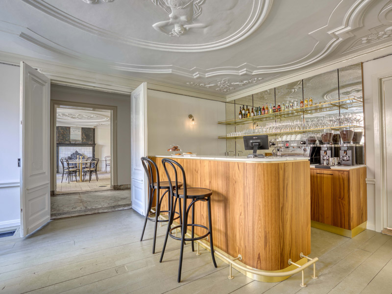 The restaurant, cafe and bar area consists of three distinctive spaces on the ground floor. The mid-century Milanese espresso bar central to the design features marble high tables and wooden high chairs and creates an everyday informal setting, inviting people to gather and enjoy a quick espresso, glass of wine or a cocktail.