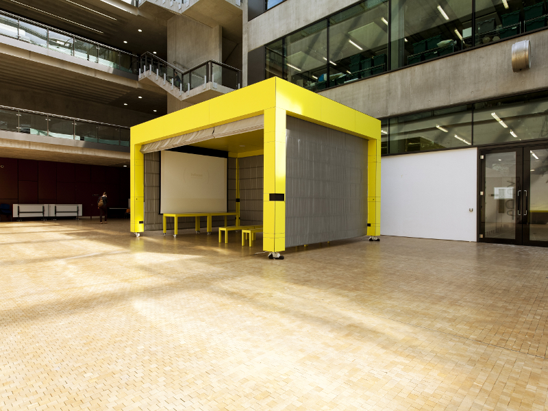 'The key thing was to do something that wasn't too restrictive and that people could take ownership of and change it and adapt it,' says practice co-founder Sarah Featherstone, who is also a tutor on the Narrative Environments MA course at CSM. The use and layout permutations are myriad and Featherstone Young has even gone to the trouble of suggesting, via diagrams, a few options until the students truly make them their own. It's a clear family, the larger pieces steel-framed, and all of them finished off in exterior-grade phenolic board (for robustness) in a family of green to yellow colours that those familiar with Featherstone Young's award-winning output may have seen before.