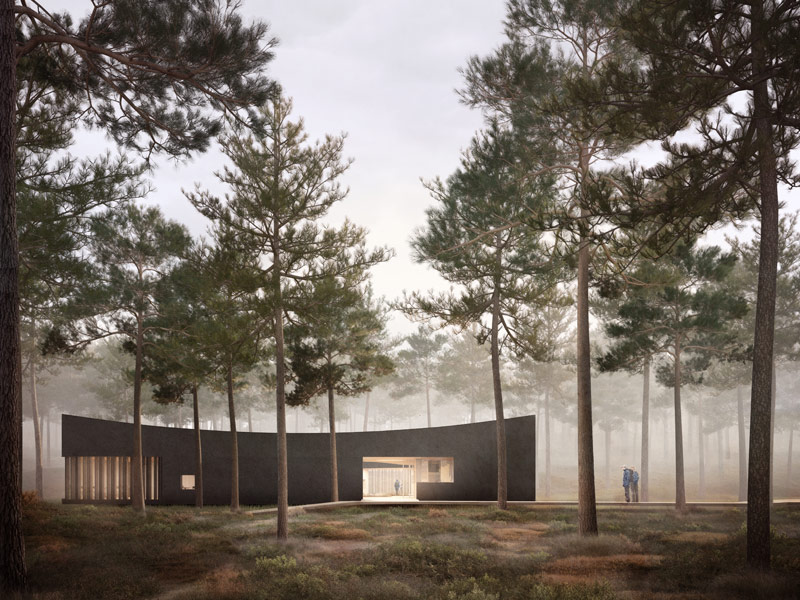 Denizen Works was invited by the National Trust for Scotland to create a rangers’ base and visitor centre to act as a gateway to the Cairngorms National Park. This poetic, low-key design that feels like it has been materialised from the landscape rather than imposed upon it, is their response: square in plan with a profile inspired by the region’s gently rolling valleys, it is clad in a seamless black liquid applied membrane, its elevations animated by shadows from the surrounding pine forest.
