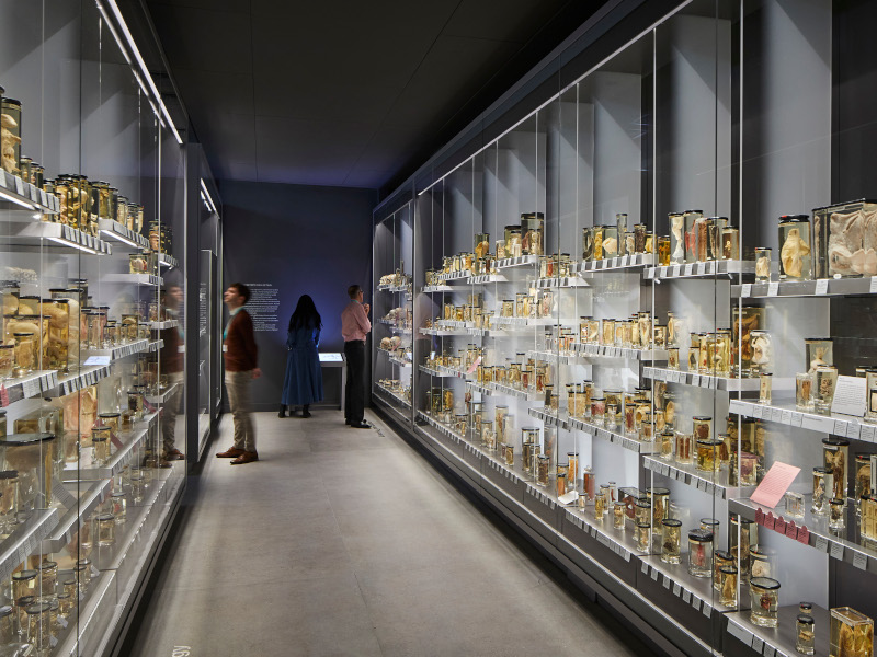 In terms of impact, I would say Casson Mann has matched the former display, albeit with a totally different atmosphere achieved by painting the hall in sombre, dark grey, which makes the spotlit specimens all the more theatrical. Where the white setting of the previous display rather highlighted the yellowing tissues, Mann’s team chose this grey to cast a pinker, fresher glow over the specimens. They also spent ‘years and years’, says Mann, working with the curatorial team to ensure that each specimen has its own, short label, clearly flagged up so you can see exactly what you’re looking at (unlike before).