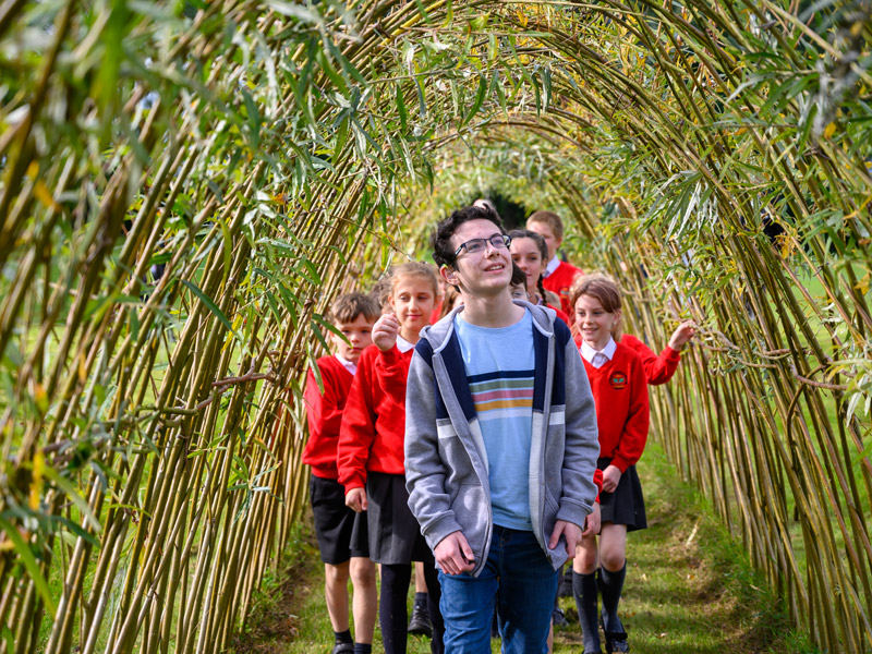 Luckily, this school community was more than happy to get involved. Workshops evolved around diverse topics, and the outcome of the pupils’ explorations are now splashed around the school’s classrooms and corridors. For example, Cropton began with a mapping activity, called ‘measuring with all our senses’, asking pupils to note how they feel, what they see and hear and smell, as they explore the field – this influenced both the placement and the forms she created. The ‘Fallen Logs’ structure emerged from a story devised in a creative writing class exploring how the region’s plant and animal life have evolved over the centuries. In Cropton’s own explorations of the local area, she noted the presence of ancient ‘holloways’ (tree-enclosed walking routes, some of which then became roads) and has created a new one for the school: a 20m willow archway, which will densify over time. Time is always an element in Cropton’s practice – designing in features that reveal seasonal changes and evolutions through use. Here, this includes a raised wildflower meadow and orchard and the ‘future archaeology’ wall she has placed midway along it, cutting a slice through this flower-strewn hillock. This cross-section is now lined with locally sourced clay bricks and fossil tiles the children created, in a workshop which asked: what will be the fossils of the future? Whistles, keys, jigsaw pieces, footprints of farm animals and tyre tracks were among the pupils’ predictions.