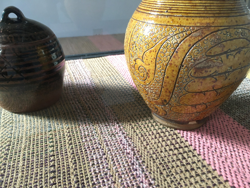 Your haptic sensibilities thrill to the anticipation of touch, moving from that warm fabric to the chilly substance of the ceramics; the contrast between clay and wool and their heavy metal, monolithic display case. Your eyes feast on those flashes of colour threaded through the textile to complement or contrast with the sludge-like tones of Leach’s pottery. Althoff (whose own work fills the larger ground-floor gallery) says he wishes his paintings could function like Leach’s pots and ‘become part of (their owner’s) life to such a significant degree that they will grow a soul of their own within the heart of the one to use them’. What he speaks of is a relationship that only comes with daily encounter, with the familiarity and ease of use. No screen-based experience can come close to flagging up or emulating that. We consume what is on our screens so fleetingly.