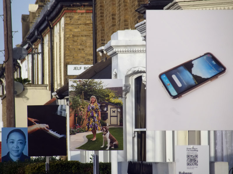 The individuals represented on this street installation – Dalberg Road, Brixton – via estate agent-style placards stuck on peoples’ garden gateposts, are drawn from all over the UK, from Harrogate to Truro (with NHS personnel sourced thanks to support from the NHS and the Health Foundation). As with all of Patey’s projects, the resulting work is a collaboration with many different creatives, including a number of photographers (deployed according to location) and recording/sound professionals – all of whose day jobs in broadcasting, publishing or film had been put on hold thanks to the pandemic. The selected individuals were photographed, between lockdowns, along with an item that has meant the most to them. These images are depicted either side of the placard, along with a QR code that activates a 10 minute recorded interview accessed either via your phone or – if you want to hear their stories in the comfort of your home – from a dedicated website.