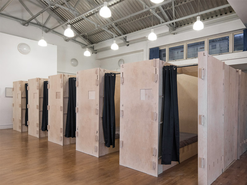 In a hall in Lewisham, a set of sleeping pods in fireproof birch plywood are offered to the local homeless by local charity 999 Club - Cameron Maynard