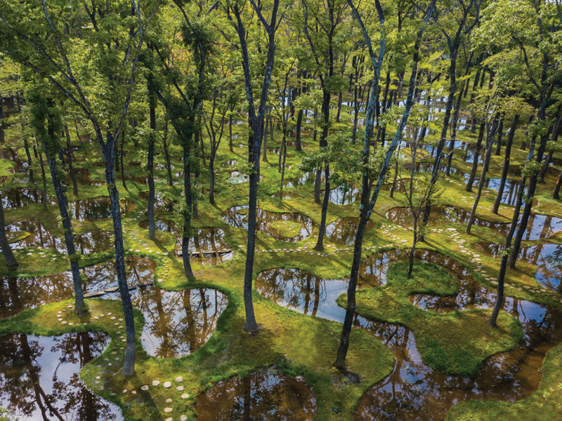 The inaugural prize – which brings with it a very generous €100,000 – is awarded to Junya Ishigami, a young Japanese architect already feted for his rigorous, seemingly gravity-defying structures, which have won him a prestigious Golden Lion at 2010’s Venice Architecture Biennale, and the commission for 2019’s Serpentine Pavilion. But this time it is not a structure but a garden he has created. The Art Biotop Water Garden sits at the foot of Mount Nasu in Tochigi, north of Tokyo, next to an artist’s retreat, Art Biotop. Ishigami, when scoping out the area, discovered a hotel was about to be built in an adjacent spot, currently covered with mature forest, all of which would be destroyed in the creation of the hotel. Ishigami suggested replanting the forest – moss and all – in an adjacent meadow, a former rice paddy, thereby creating an extraordinary water and forest-scape. It’s a pretty novel idea, and certainly not the easiest nor cheapest to implement, but it allowed Ishigami to set out some bold parameters: nothing new was to be used in the creation of this garden; everything that could be used from the forest was to be reused. But he went further. He sculpted the rice paddy into a connecting network of small, elliptical ponds, each one a biotope – a miniature habitat for aquatic plants and animals. By utilising an existing irrigation system, plus the site’s gentle slope, he ensured that fresh water is continuously drawn through and around the site, providing mesmerising and ever-shifting reflections and patterns of light. The 380 mature trees he relocated were uprooted and replanted over the course of four years, with the trees grouped in sympathetic arrangements around the ponds, at a closer density than would normally be found within nature. Thus, the jury summarised, he had created a garden that is both ‘a highly artificial landscape, carefully modelled and dependent on technological artefacts’, and ‘an undeniably natural and living organism that grows and changes by its own inherent dynamics’. The jury, chaired by US landscape architect Martha Schwartz, and including directors of leading international practices – such as Kjetil Traedal Thorsen of Snøhetta – declared that ‘the project demonstrates how we can interact with and make our imprint on nature without destroying it’.
