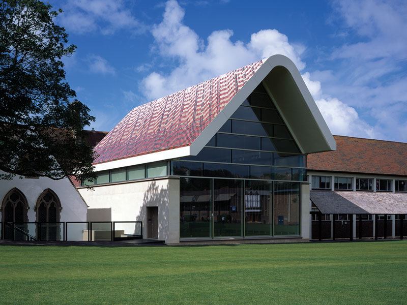 Inspired by Gilbert Scott’s flint gable on the main school building, Eric Parry Architects’ limestone-clad music school takes the form of a rectangular plan, with a ‘floating’ pitched roof ‘hovering’ above a grand, lofty, recital hall. The roof’s composite steel and timber structure is finished with a pattern of red, glazed ceramic tiles that pick up on the russet-coloured roofs of the older buildings.