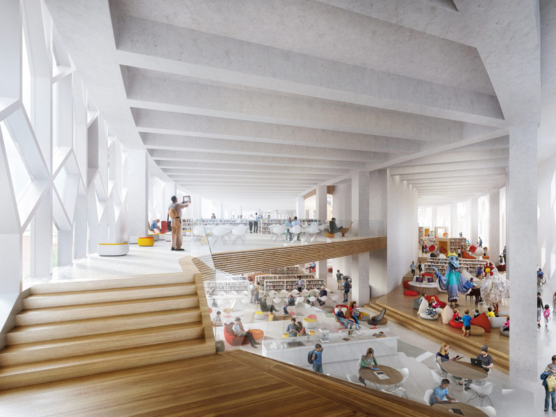 The resulting scheme challenges the associations and behaviours of conventional library and exhibition spaces.
