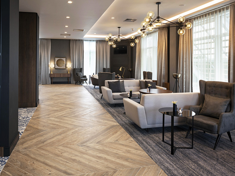 Overlooking Hampshire County Cricket Club is the 171-bedroom Ageas Bowl by Hilton hotel, which opened in May and whose Lakeview Sports Bar typifies this venue's stylish vibe. Falconer Chester Hall wanted to give the flooring a 'classic look', and this is represented by a chevron patterning.