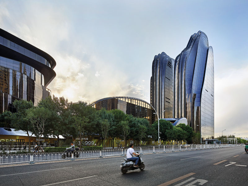 The plaza’s standout structure — an imposing, two-tower building shaped by a series of undulating fins — is curved, asymmetrical and encased in dark-tinted glass. Although captivating to behold, the looming black towers take on an opaque, ominous quality by dusk. In contrast, most of the neighbouring buildings are pale, angular and uniform. And while the Ma’s practice, MAD Architects, is marketing the mixed-use development as being in Beijing’s Central Business District, it actually sits apart from the city’s modest collection of skyscrapers.
