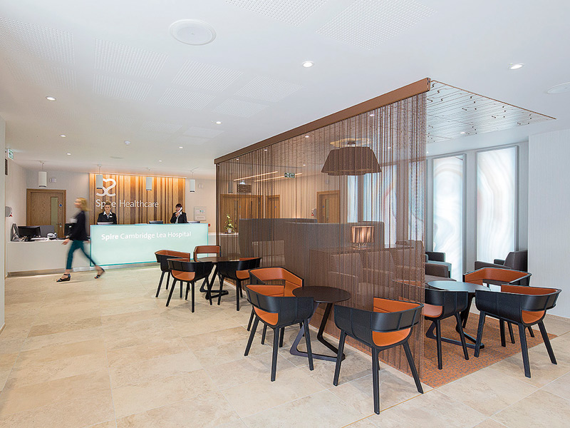 In the Spire Cambridge Lea health facility reception, the carpet in the seating area is bespoke from EGE carpets