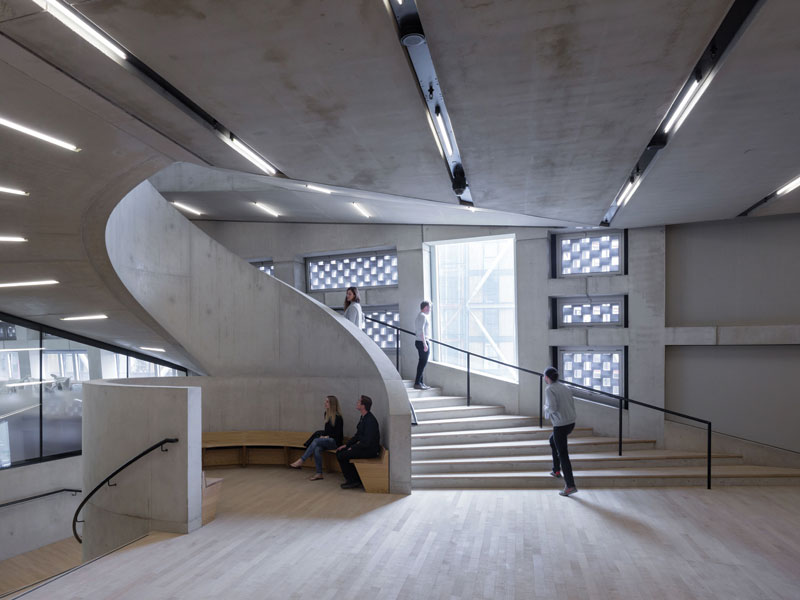 These much-admired circulation areas are tranquil, elegant spaces lined in white engineering brick with recessed, precast concrete handrail. This contrasts with oak treads and risers and timber balustrading.