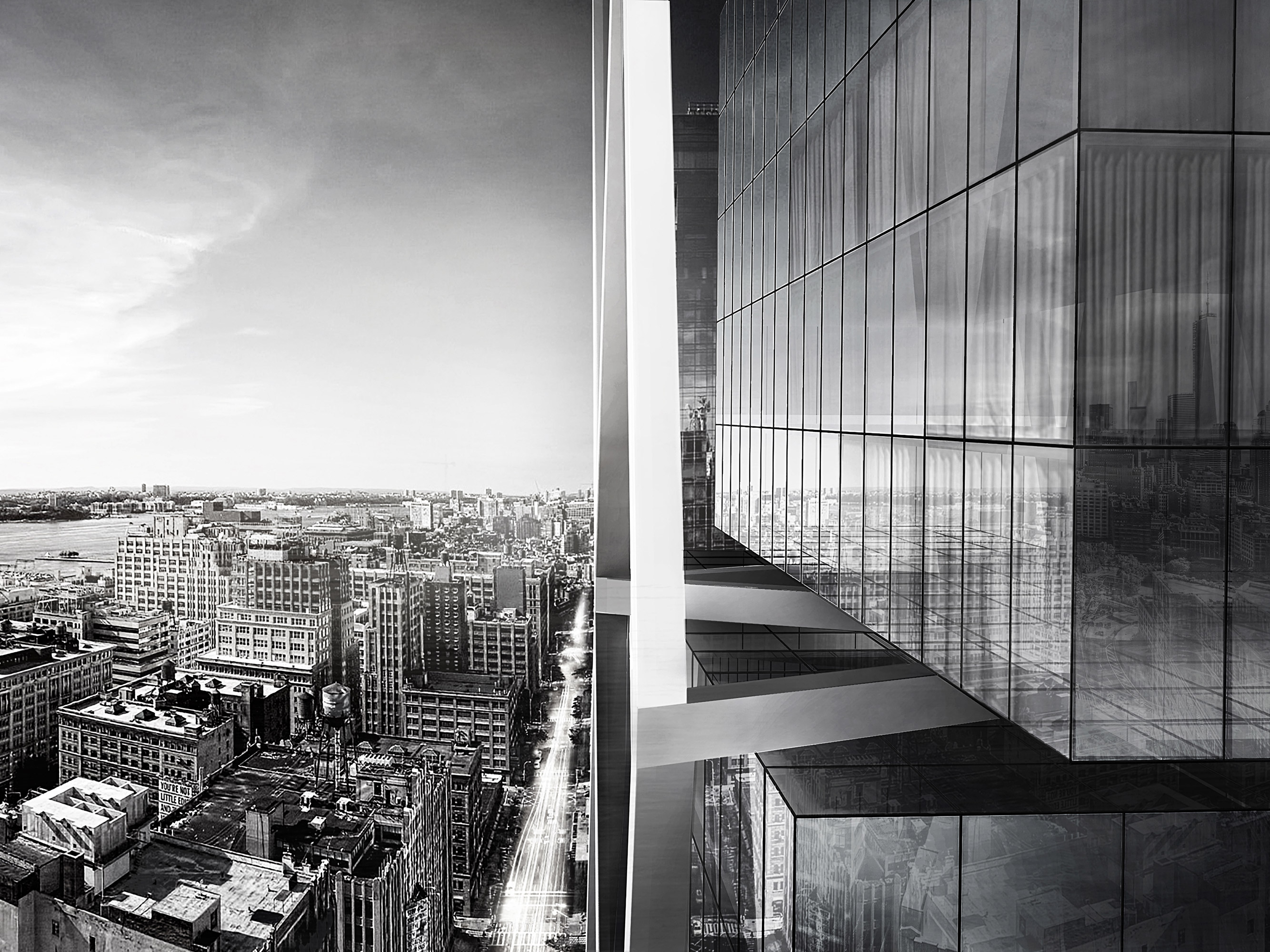 Geometrical and refined, 100 Varick is a combination of glass columns and criss-crossing beams spanning 25 floors and split into individual five-story units. 100 Varick was created for a closed competition headed up by developer Michael Shvo and uses a 'QuaDror exoskeleton', where glass is inserted into openings formed by the external frame. Its appearance is similar to a giant rubrics cube not quite completed and enclosed in a frame. The design was influenced by the structural efficiency of a 'diagrid' illustrated by Sir Norman Foster.
