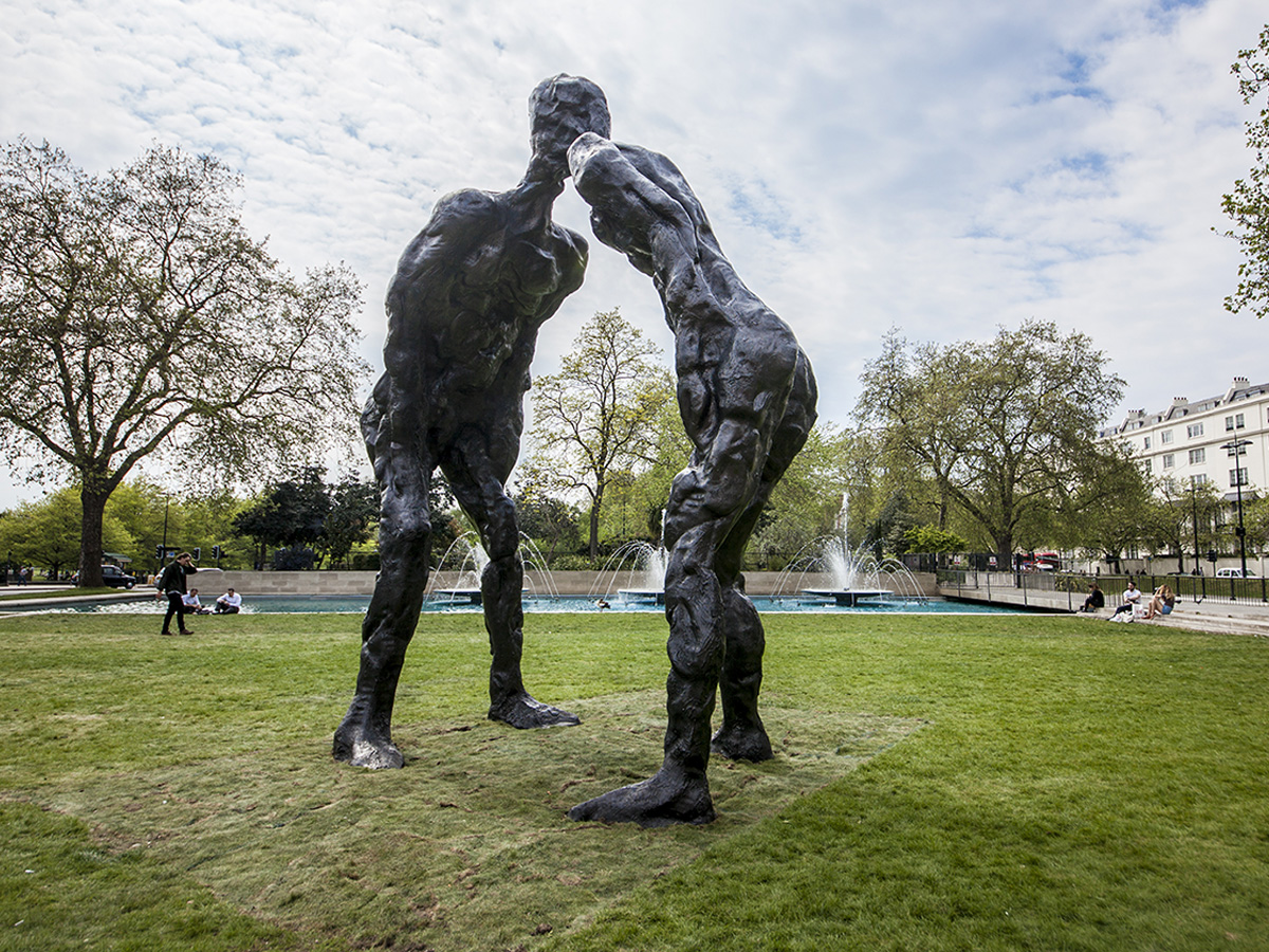 The two heavily-textured bodies - a trait seen in all of Breuer-Weil's monumental pieces - come together to form a human arch, in a nod to the statue's physical location at Marble Arch.