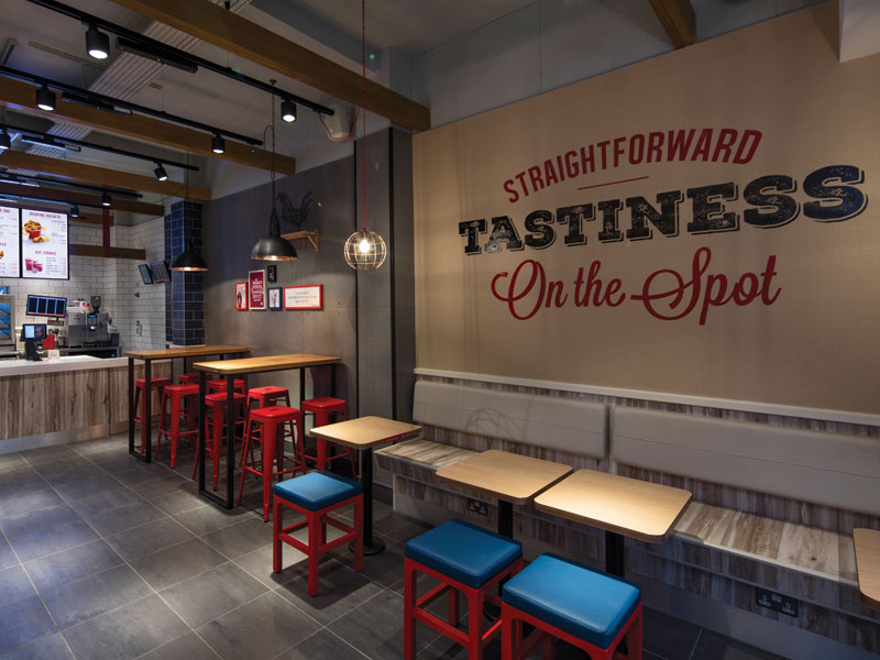 McDonald’s and KFC are picking up cues from street food stalls and pop-up restaurants, as well as the more Heath Robinson-style co-working spaces. Both have introduced new formats that lean towards the virtually ubiquitous groovy DYI- style aesthetic. For KFC, design consultancy I-AM has brought in large-format plywood wall panels with embedded graphic motifs. The consultancy art-directed the illustrations and photography using fresh herbs and handcrafted typefaces made from flour. The new messaging has been offset against panels of raw concrete, and ceramic and timber effects elsewhere. Meanwhile counter fronts have tongue-and-groove panelling in a variety of light and dark-wood tones. This new format first appeared this summer in Newcastle, and will be rolled out.
