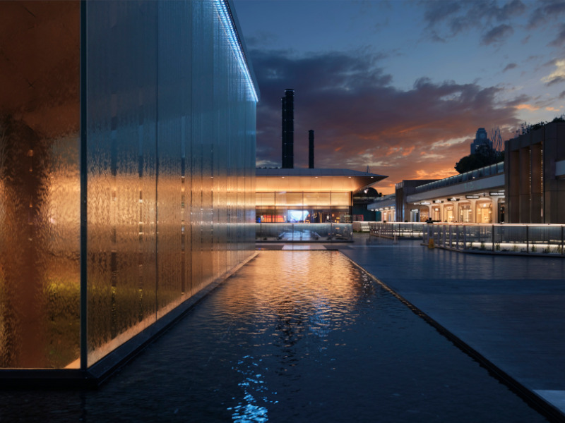The glazed Central Cube marks the access to rail links to the city. The outer glass walls are washed outside by water, while inside a folded origami-like structure surrounds a stand of bamboo. The light creates a beautiful glow with gentle animation in the water-washed glass but equally provides vital functional light for wayfinding and orientation.