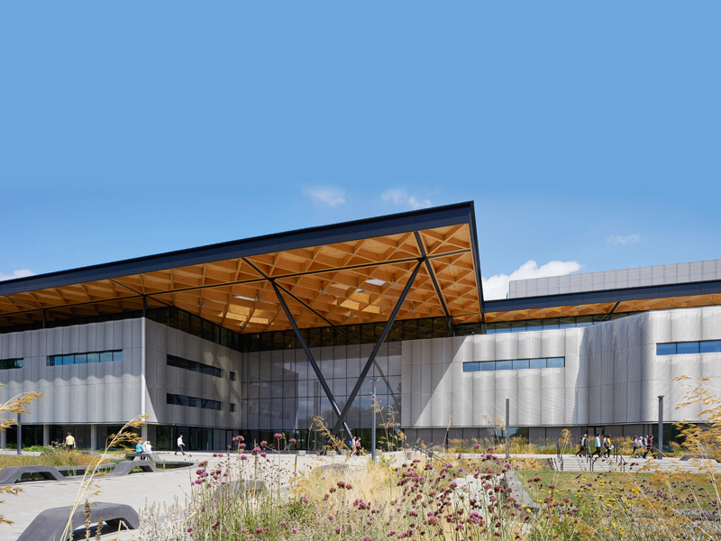 Parked on a prominent spot just beyond the entrance to the university campus, its design evokes the mid-century heyday of both motor and aeronautical engineering – with its wide, sweeping lines, elegant curves and chrome edgings – combined with the new, ecological aesthetic of the 21st century, as articulated in gleaming, pale surfaces, light touch technology and its use of timber, most notably the diagrid beams of the huge timber roof, which appear to float above the curving, glazed exterior.