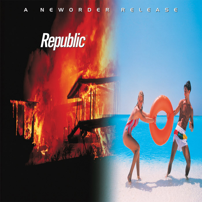 Peter's design for the sleeve of New Order's Republic was inspired by his interest in the possibilities created by software such as Photoshop, and his colleague Brett Wickens' perfection of the technique of blending one photograph seamlessly into another. There is an often-repeated graphic design rule: never allow technology to drive design! Peter broke this rule to brilliant effect. The proliferation of technology -- allowing the fusing of different sources, not only still images, but also sound, movies and text -- has revolutionised the production and consumption of culture. Peter's brilliantly ugly/beautiful, awkward/elegant design for Republic heralded that change.
